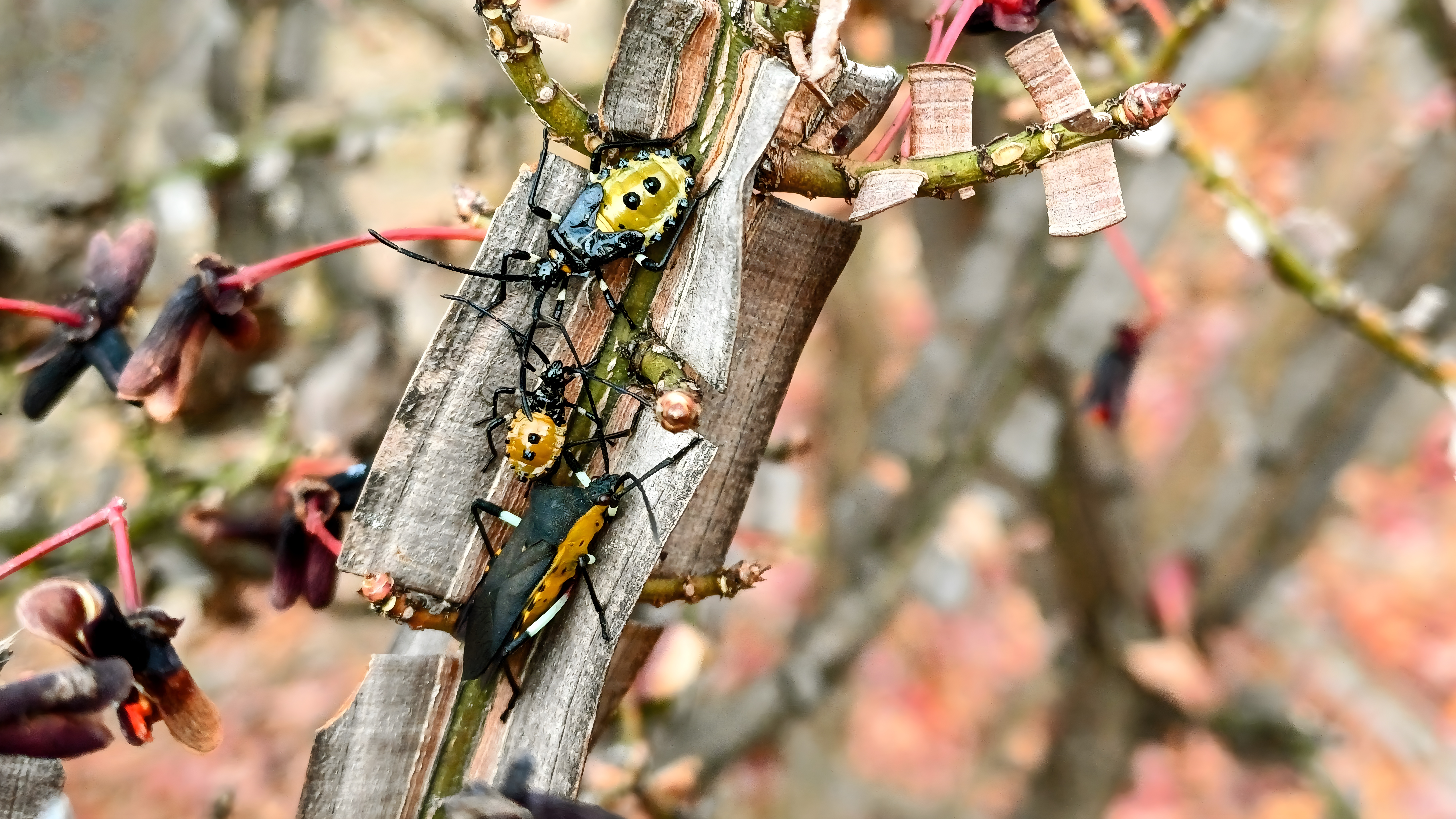 화살나무에서 월동준비하는 노랑배허리노린재 약충과 성충