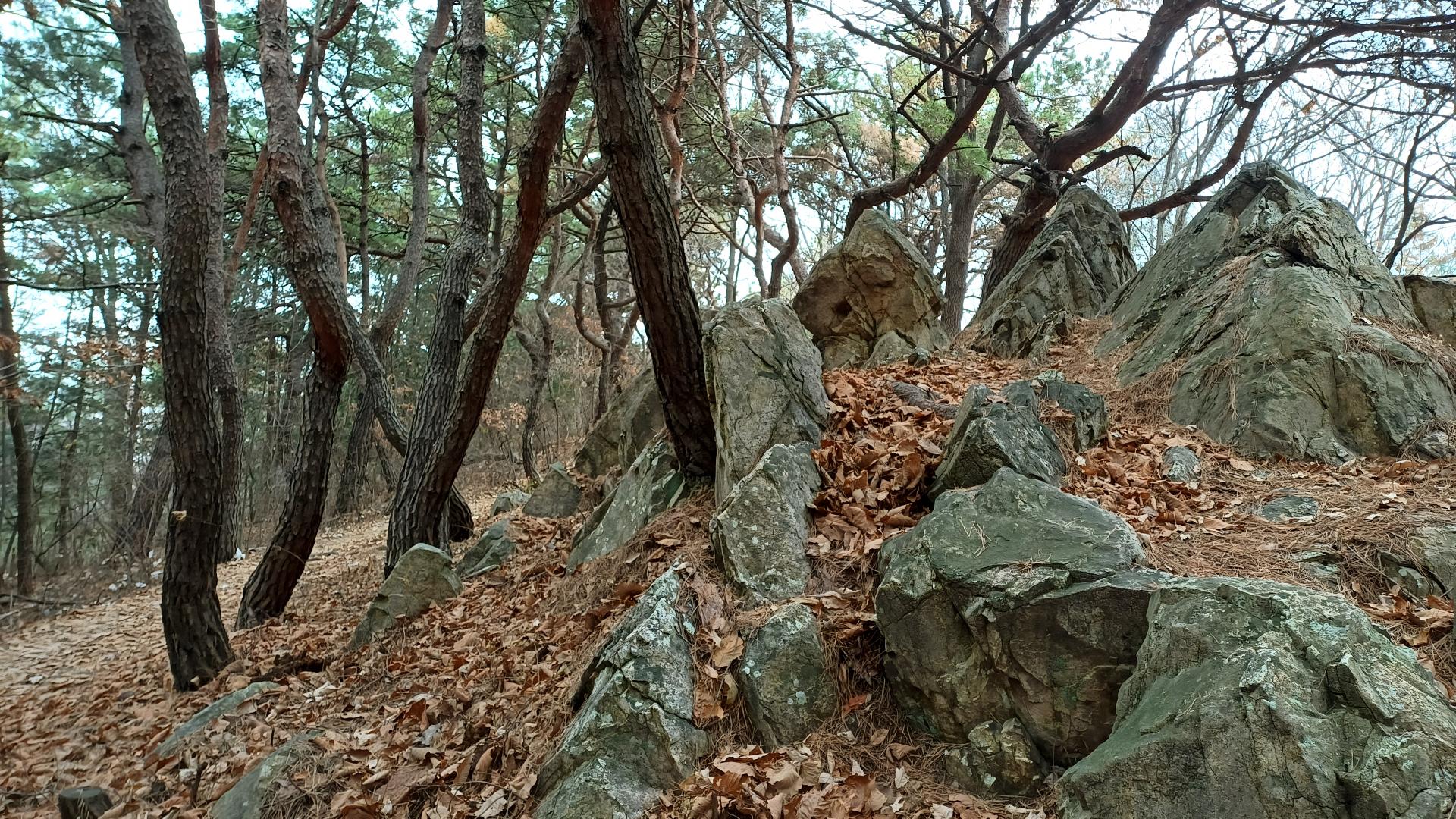 겨울 숲속 바위 봉우리 #공원 #산책로 #숲 #숲속 #소나무 #바위 #낙엽 [원본: 해상도 = 8000x4500, 크기 = 13.5MiB]