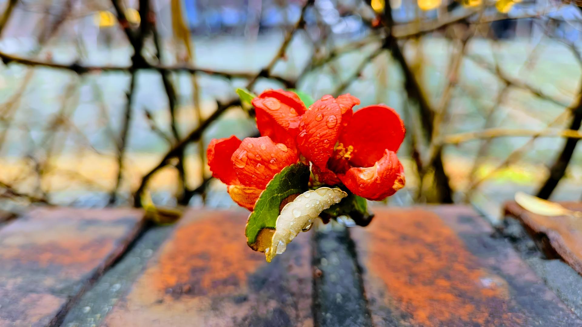 겨울비 머금은 때늦은 명자나무 꽃 #물방울 #꽃 #명자나무 #담장 [원본: 해상도 = 8000x4504, 크기 = 5MiB]